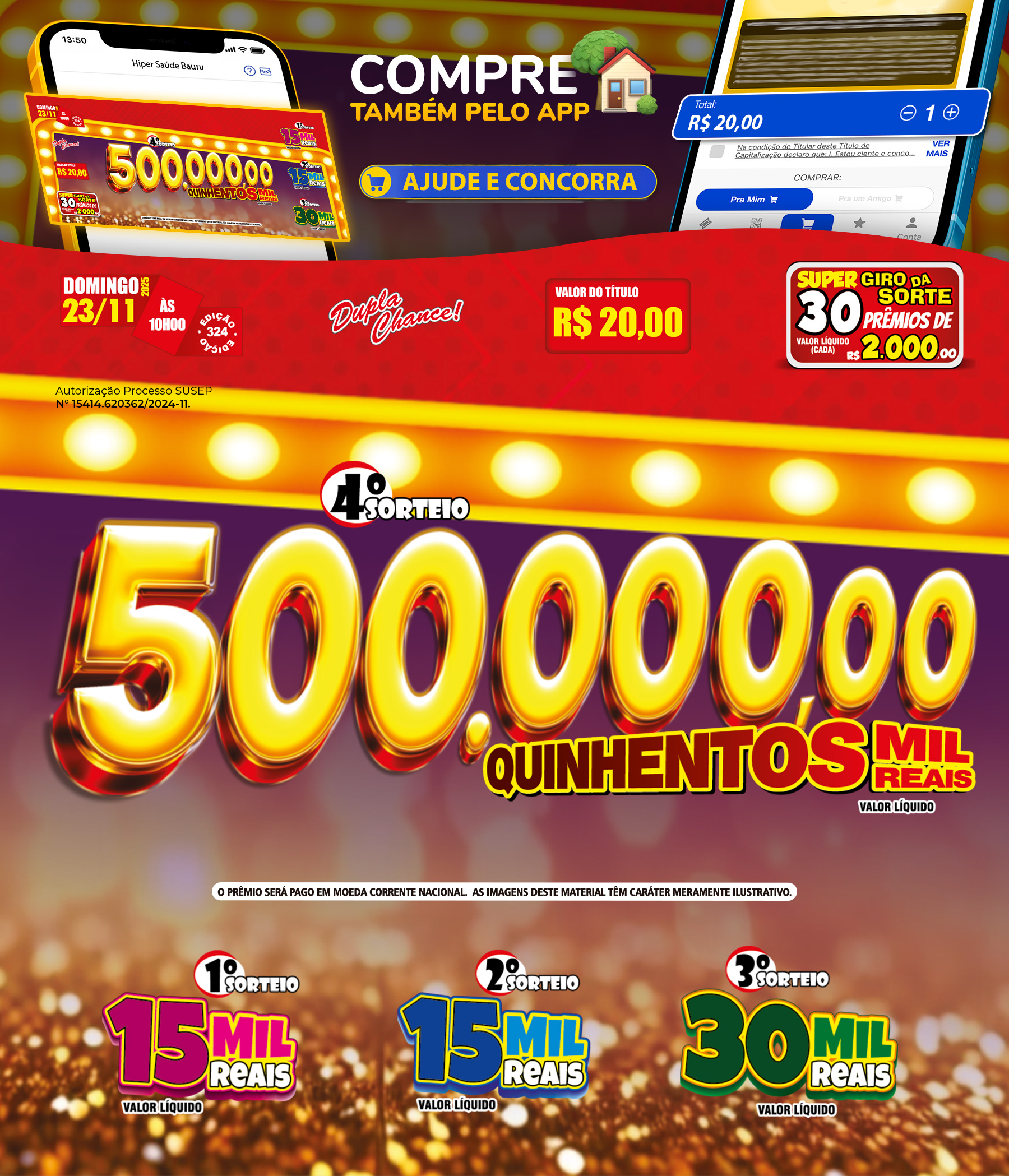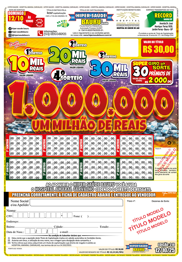 Sorteios decorrentes de Títulos de Capitalização de Pagamento Único, da Modalidade Filantropia Premiável, emitidos pela INVEST Capitalização S/A., inscrita no CNPJ sob nº 93.202.448/0001-79 e aprovados pela SUSEP. Você pode ajudar o Hospital Amaral Carvalho comprando o Hiper Saúde Bauru e cedendo o direito de resgate. A aprovação deste Título pela SUSEP não implica, por parte da Autarquia, em incentivo ou recomendação a sua aquisição, representando exclusivamente, sua adequação às normas em vigor. Antes de contratar, consulte previamente as Condições Gerais.
