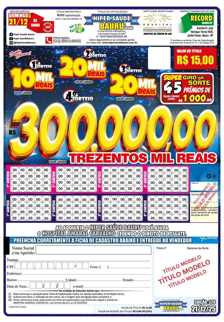 Além de concorrer a valiosos prêmios, você ajuda o Hospital Amaral Carvalho, cedendo o direito de resgate do título.