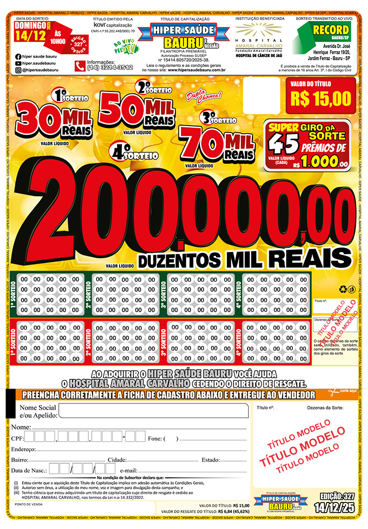 Sorteios decorrentes de Títulos de Capitalização de Pagamento Único, da Modalidade Filantropia Premiável, emitidos pela KOVR Capitalização. Você pode ajudar o Hospital Amaral Carvalho comprando o Hiper Saúde Bauru e cedendo o direito de resgate. A aprovação deste Título pela SUSEP não implica, por parte da Autarquia, em incentivo ou recomendação a sua aquisição, representando exclusivamente, sua adequação às normas em vigor. Antes de contratar, consulte previamente as Condições Gerais.