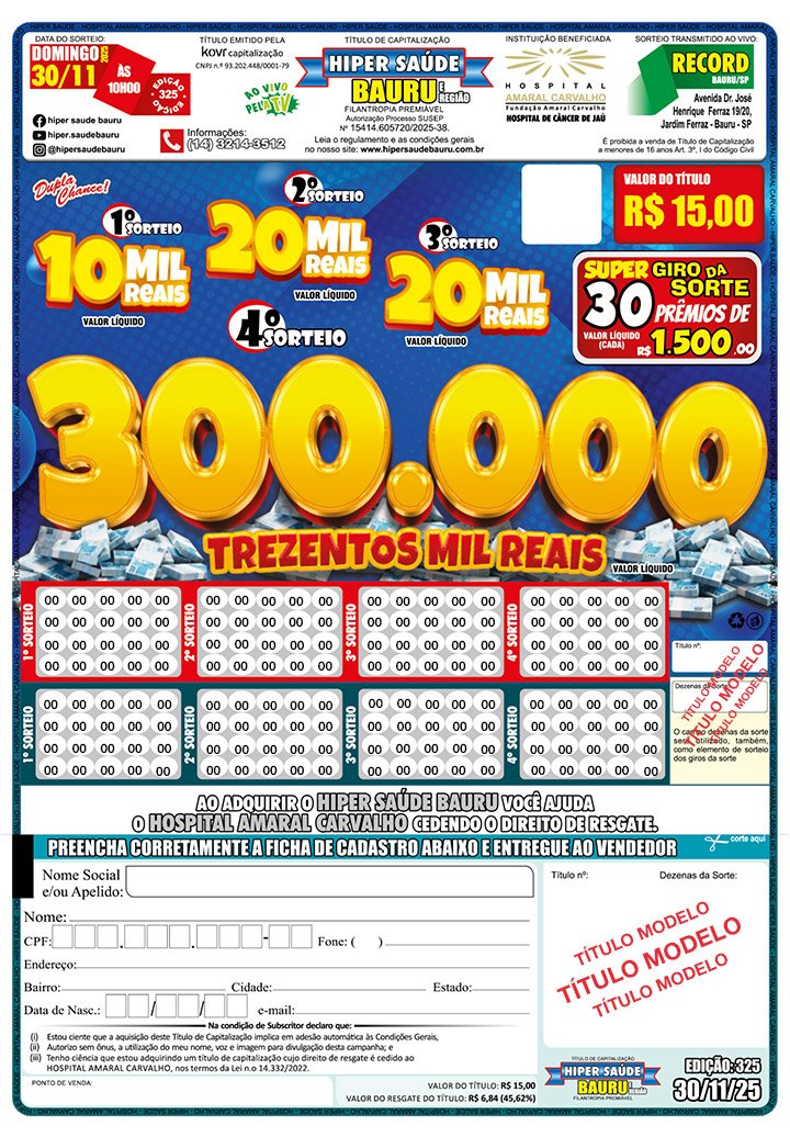 Sorteios decorrentes de Títulos de Capitalização de Pagamento Único, da Modalidade Filantropia Premiável, emitidos pela KOVR Capitalização. Você pode ajudar o Hospital Amaral Carvalho comprando o Hiper Saúde Bauru e cedendo o direito de resgate. A aprovação deste Título pela SUSEP não implica, por parte da Autarquia, em incentivo ou recomendação a sua aquisição, representando exclusivamente, sua adequação às normas em vigor. Antes de contratar, consulte previamente as Condições Gerais.